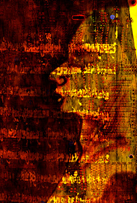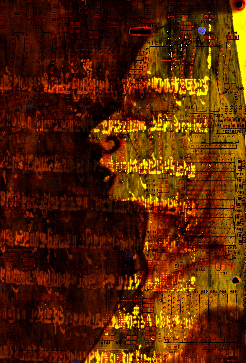 Element - dig. collage - charcoal sketch, text, circuitboard. |